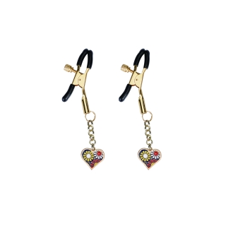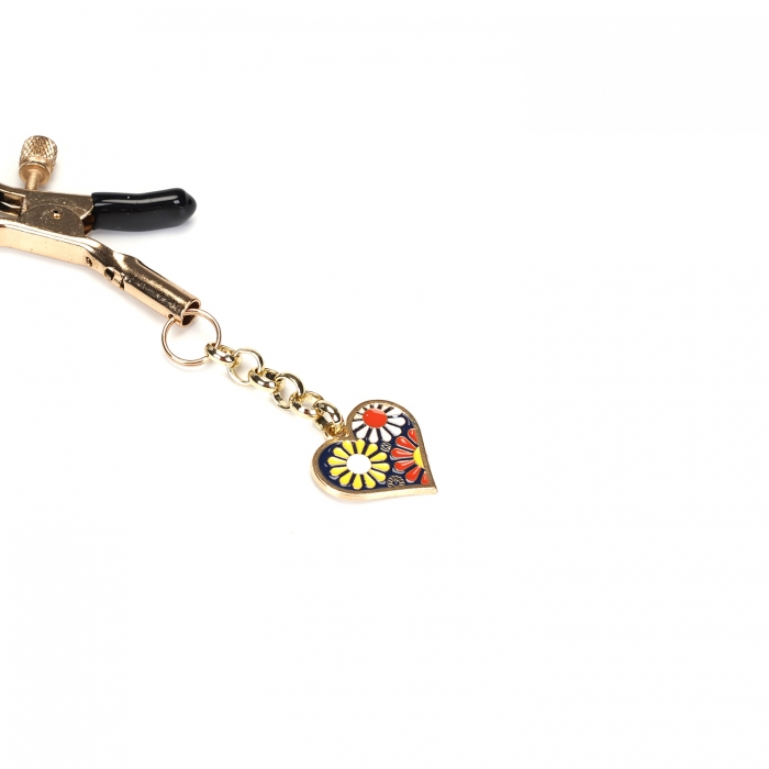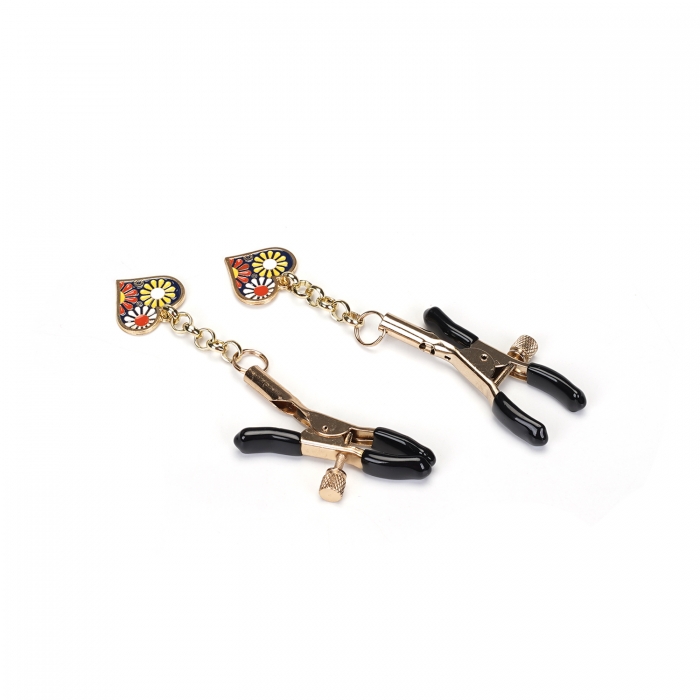 Cleme pentru sfarcuri prevazute cu manson din cauciuc pentru un confort sporit in timpul utilizarii, cu sistem de prindere pe baza de surub. Sunt accesorizate cu un pandantiv in forma de inima decorata cu flori.