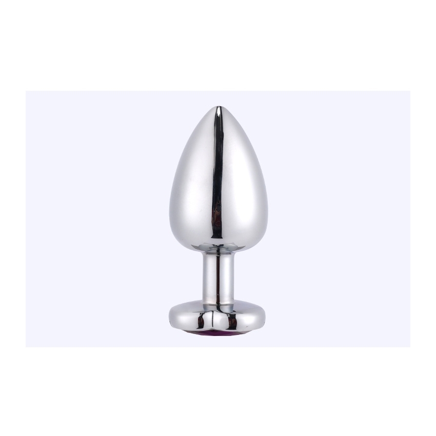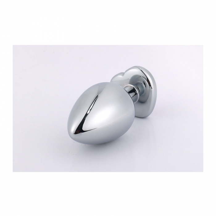 Dildo anal metalic in forma clasica de dop, ovala si ascutita spre varf, cu baza mai lata pentru siguranta si manevrare facila. Baza este in forma de inima, decorata cu o piatra alba si cantareste 160 gr.