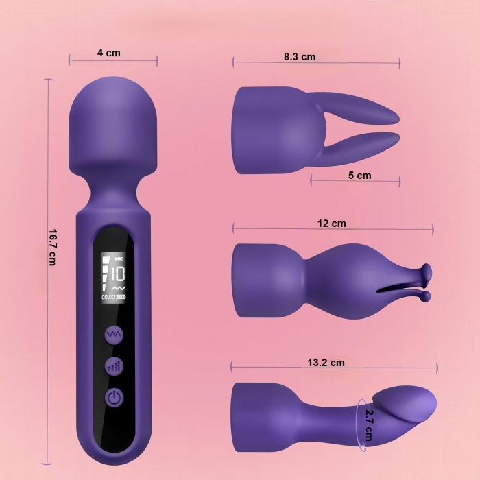 Vibrator wand, perfect pentru masarea zonelor erogene, prevazut cu 3 mansone diferite care se pot atasa de acesta. Dispune de ecran LED care indica nivelul bateriei dar si cele 10 moduri de vibrare. Vine la pachet cu un cablu USB pentru reincarcare.